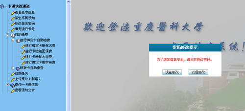 各位同学: 医保费网络自助缴费模块现已开通,愿意参保的同学可在网上或者圈存机上缴纳医保费,具体流程如下。 一、网上交医保费 1、登录一卡通经费查询系统(网址:https://ykt.cqmu.edu.cn:80/login.do)。 2、选择“自助缴费”,选择“建行绑定卡自助缴费”,选择“建行卡缴纳医保费”。